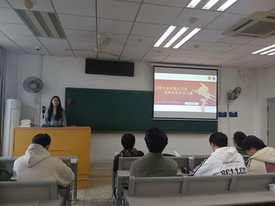 活动伊始,团支书通过PPT演示与视频讲解相结合的方式,带领同学们回顾了中华民族共同体的历史脉络与现实实践。从“四海之内皆兄弟”"的先秦理念到秦汉“大一统”政治格局,从“三千孤儿入内蒙”“齐心协力建包钢”的历史佳话到西藏那曲生态旅游增收、云南独龙族整族脱贫的当代成就,一幅幅生动的历史画卷与发展图景,让同学们深刻认识到各民族之间休戚与共、荣辱与共、生死与共、命运与共的紧密联系。