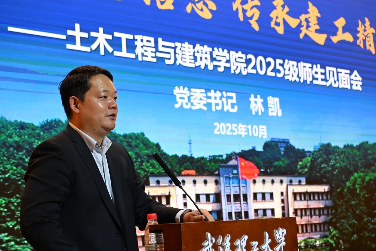 党委书记林凯以“坚定理想信念,传承建工精神”为主题,系统阐述了学院“时代新人铸魂工程”引领下的育人体系。他介绍了以“12345”为架构的学生工作思路,以及“建苑筑梦”科技文化节、“回望家乡的红色”等品牌活动,并列举了陈蕾、孔乐然等杰出校友的榜样事迹。林书记勉励新生筑牢信仰之基,传承建工精神,将个人成长融入国家发展,在服务“海洋强国”、“低空经济”等国家战略中书写青春华章。