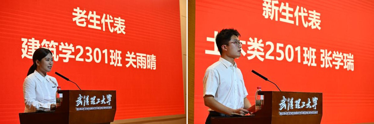 在交流环节,老生代表关雨晴同学结合自身经历,分享了大学学习与生活的体会;新生代表张学瑞同学表达了对大学生活的憧憬与决心,展现了2025级新生的朝气与风采。