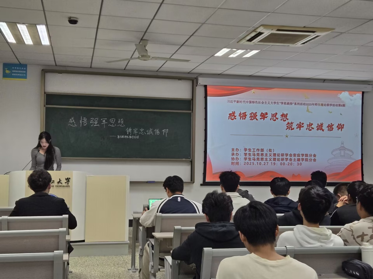 10月27日晚,由学生工作部(处)主办,安应学院马研承办、土建学院马研协办的第8期师生理论联学活动在博学东楼304开展。本次活动主题为“感悟强军思想,筑牢忠诚信仰”,由安应学院吴晨阳、陈锦然同学主持,并邀请到了raybet雷竞技网站马研指导老师周晨和安应学院指导老师周聪聪,两院马研成员以及两院入党积极分子共同参加。