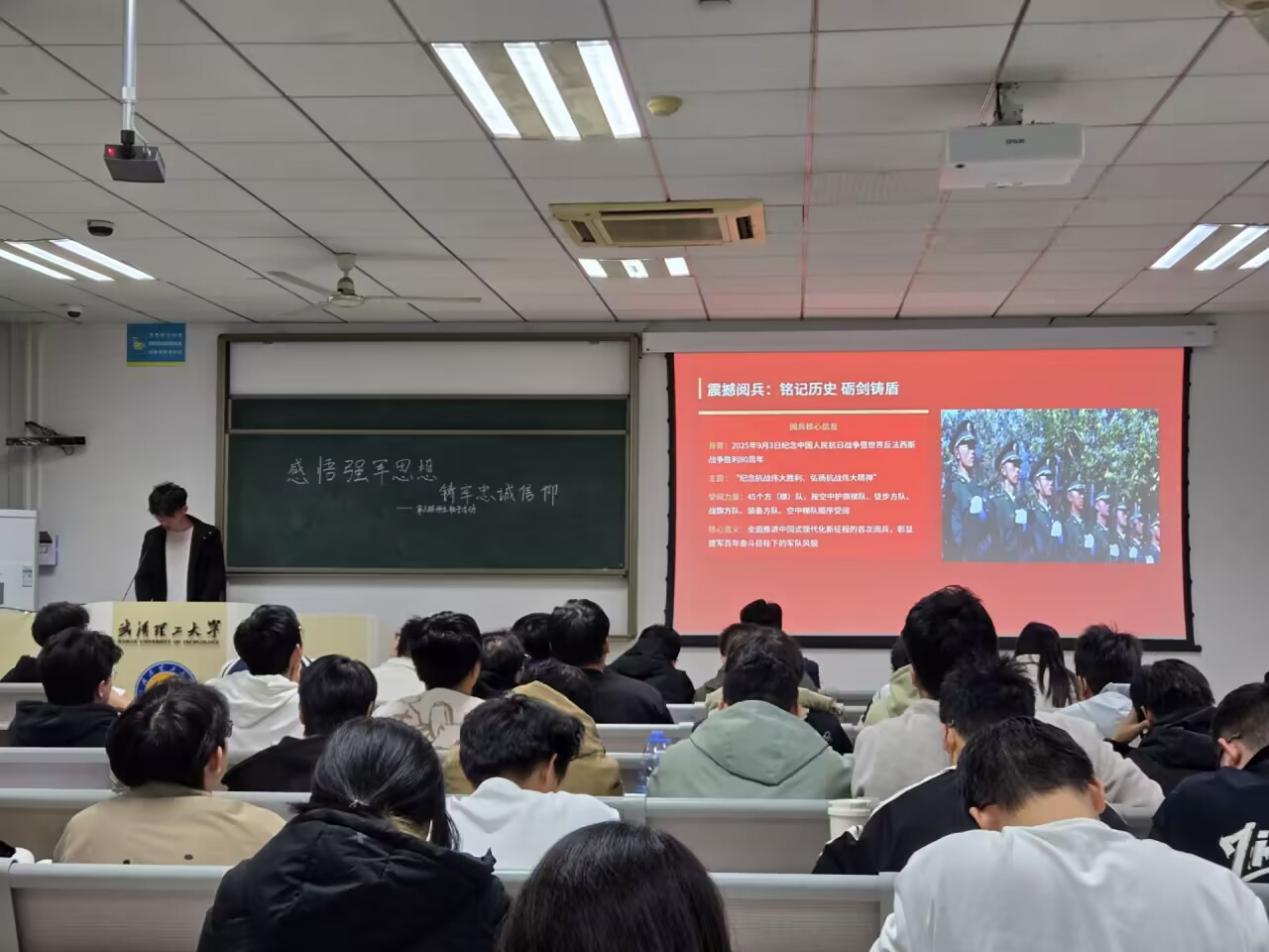 活动伊始,主持人首先介绍了抗战胜利80周年阅兵的背景与战略意义,由此引出习近平强军思想的核心要义——“十一个明确”。随后,周聪聪老师结合亲身经历与理论知识,深刻阐释了强军事业的重要性,引发在场同学的强烈共鸣,引导青年学子树立正确的世界观、人生观和价值观,激励大家为实现强国梦、强军梦贡献青春力量。raybet雷竞技网站赵浩然同学与安应学院于振海同学则以阅兵为切入口,借助丰富史料与生动案例,多角度解读了强军思想的深刻内涵,并具体阐述了其在国防和军队建设中的指导作用与现实意义。